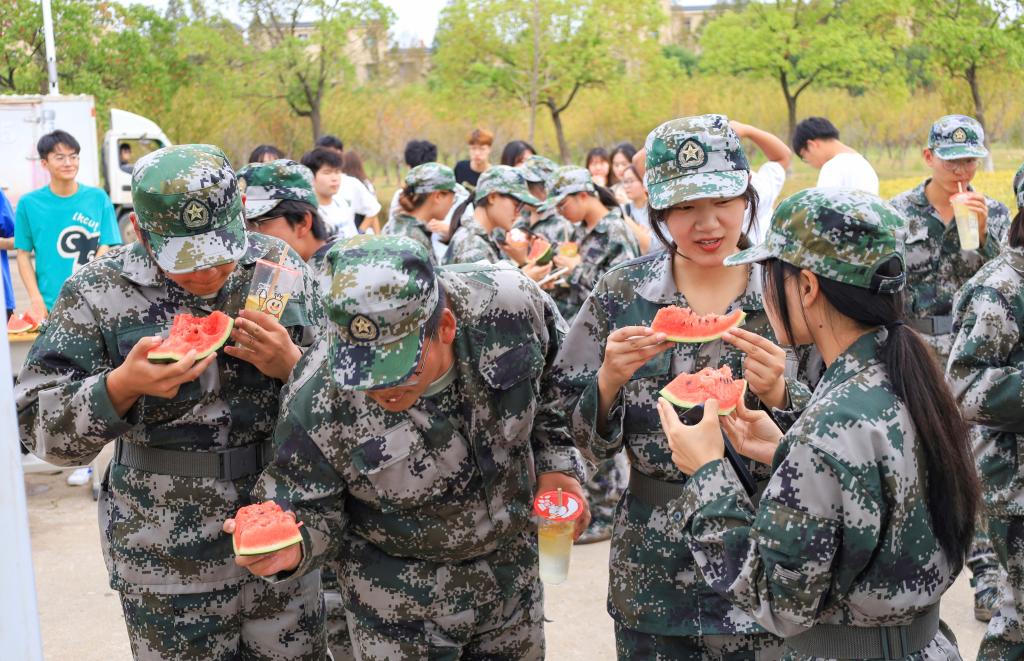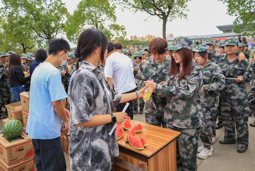 “同学,快来品尝刚刚切好的西瓜!”随着军训解散哨声响起,已经在南田径场门口等候多时的动画专业2021级的汪润向新生们喊到。当看到桌面上已经切好的新鲜西瓜时,“小绿人”们严肃的神情瞬间松弛下来。9月21日下午,2138CC太阳集团组织近20名2021级学生代表来到南门操场,给学院正在军训的2022级新生们送来一份“清凉”。