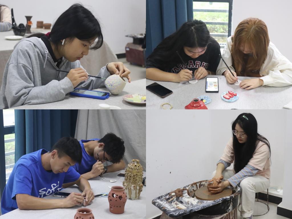 “注意找准中心”“这里要再修补一下”……动画专业2020级的黄扬正耐心指导前来体验的“萌新”们,有着一年陶艺学习经验的她向同学们分享了自己的学习感悟。“陶艺制作是一个非常考验耐心的过程,要反复打磨造型、修改上色,制作过程中大家要学会放松自己,享受过程,体验其中的趣味。”