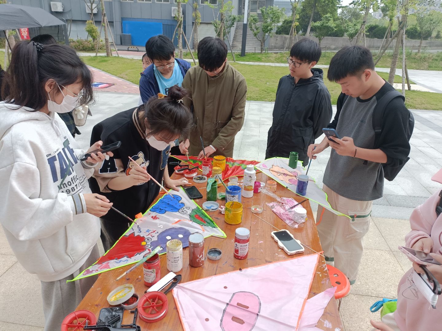 用画笔蘸取颜料、发挥想象力选定图案、为空白风筝“换上新衣”,不到一小时,一个个鲜活的卡通人物和别出心裁的景色风光便纷纷“亮相”,憨态可掬的草莓熊、栩栩如生的蟹老板、拔节而长的翠竹……每一幅作品都生动有趣,吸引着路过学生的驻足围观。