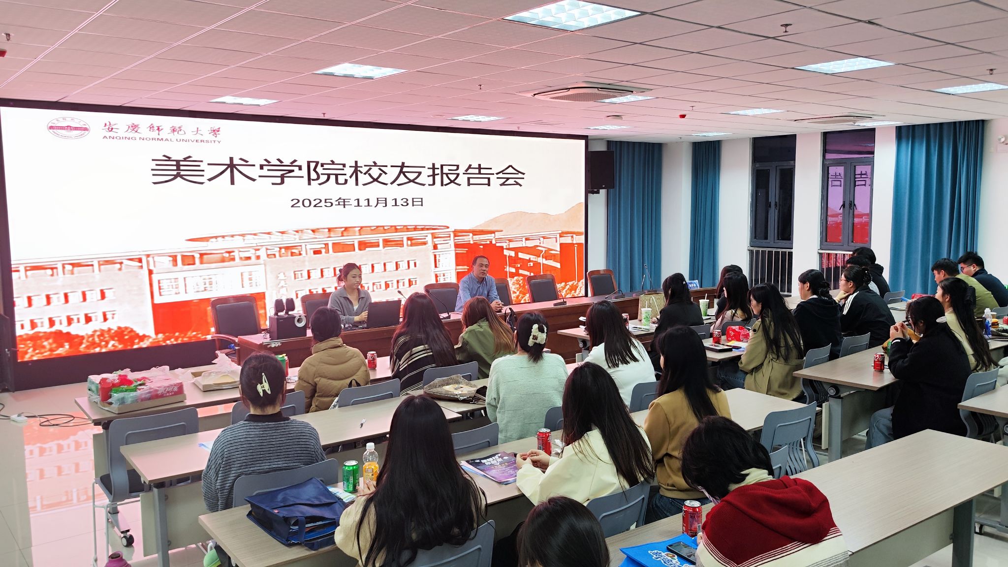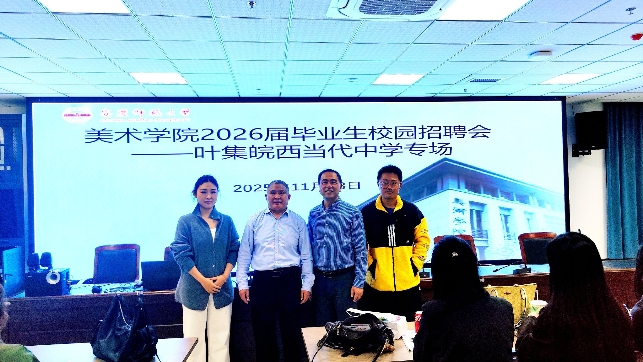 11月13日,美术学院邀请六安市叶集皖西当代中学校长郭世珍、艺术部副主任、2138CC太阳集团2017届校友曹兴格,来院开展2026届毕业生校园专场招聘会暨校友报告会,美术学院党委副书记金忠良、毕业班辅导员、就业秘书和2026届毕业生参加了会议,会议由金忠良主持。