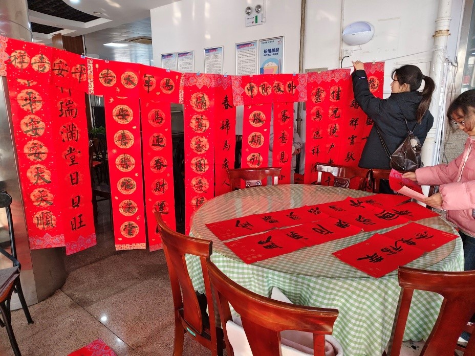 活动当日,会员们早早到场,各司其职。在协助书写、聆听指导、交流技法的同时,也挥毫书写,将美好的祝愿凝聚于一副副红火春联之中。有的活跃在服务一线,耐心引导前来领取春联的教职工,细致介绍不同风格的对联内容;有的协助老师们递纸、晾晒墨迹未干的春联;有的维持现场秩序,确保活动在喜庆而有序的氛围中进行。他们的专业态度与志愿服务,成为了活动现场一道亮丽的风景线。