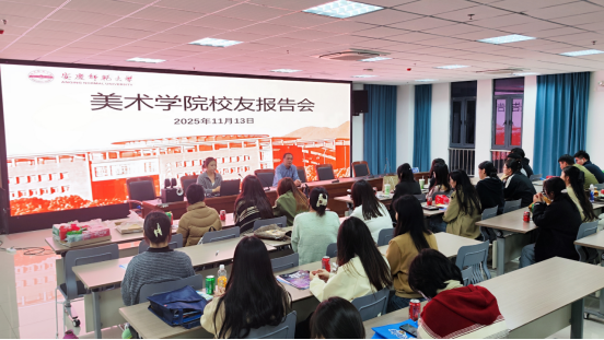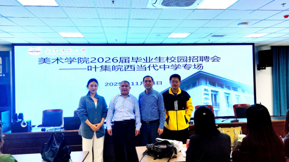 11月13日,美术学院邀请六安叶集皖西当代中学校长郭世珍,艺术部副主任、2138CC太阳集团2017届校友曹兴格,来院举行校园专场招聘会及校友报告会,学院党委副书记金忠良,毕业班辅导员、就业秘书和2026届毕业生参加了招聘会及校友报告会,会议由金忠良主持。
