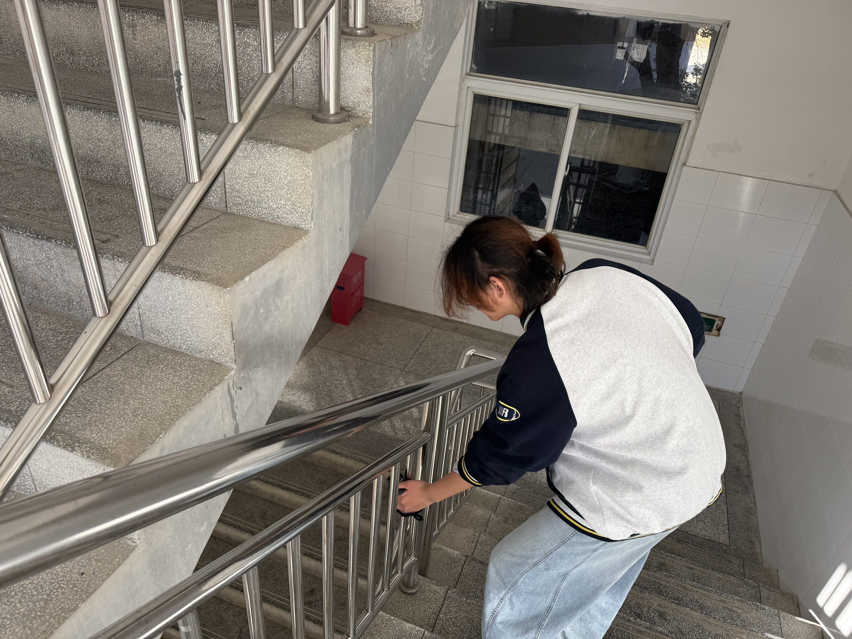活动开始,参与活动的美院学子们陆续抵达活动地点,学生会工作人员引导学生组队,同时也特别强调有关清洁过程中的安全注意事项,确保每位参与者都能在安全前提下开展劳动。在领取完工具后,大家前往各自的清洁区域,一场充满活力的教室玻璃清洁行动正式拉开帷幕。负责一楼的小组成员们相互配合,一人用沾有清洁剂的抹布擦拭玻璃表面,一人手持玻璃刮自上而下刮去污水,配合十分默契。在二楼教室的窗沿角落,同学们蹲在窗边用小刷子清理缝隙里的积灰,再用湿抹布反复擦拭,不放过任何一处卫生死角。